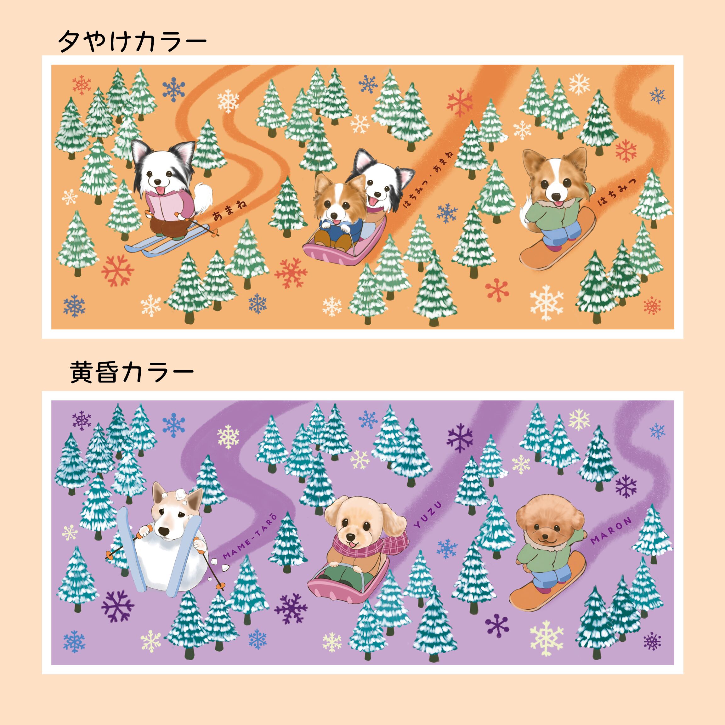 ゲレンデでスキーやスノーボードをしている子たちの似顔絵イラストが入ります。